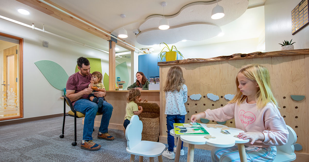 ABD Engineering & Design worked with Rowell Brokaw on the remodel of OSU’s early childcare and education Azalea House. Rowell Brokaw writes, “Several structural columns have been transformed into ‘trees,’ with green, acoustic panels forming the canopy overhead. A tree-lined interior hallway offers shelves and tackable acoustic wall panels to display kids’ art.”