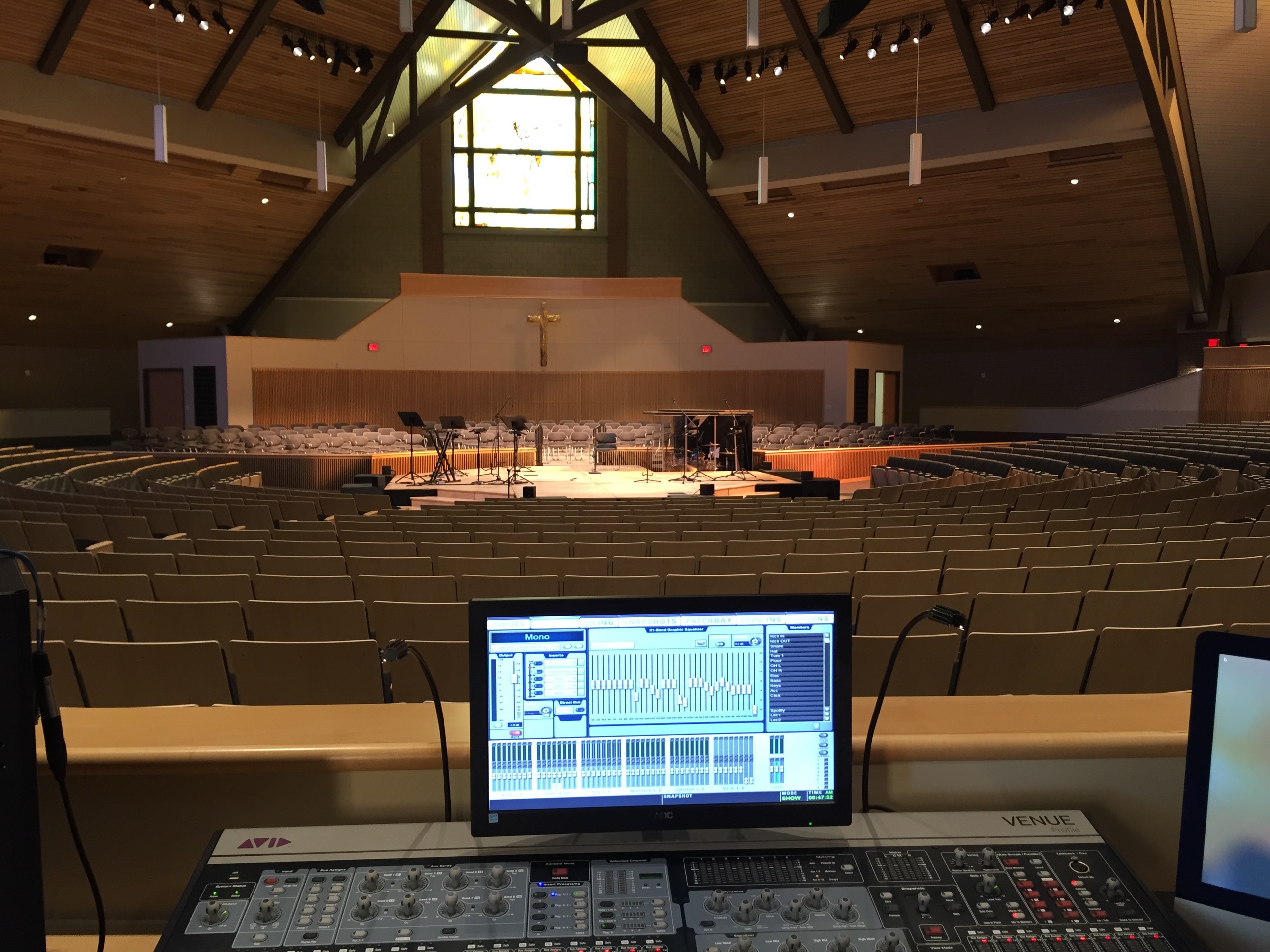 Cornerstone is a Christian University with multiple chapel services each week. A very important design element for the university was the concept of worshipping in the round to enhance community and intimacy for this 1500 seat soaring worship space. ABD Engineering and Design was hired to design the acoustics, mechanical noise control, audio, video, and specialty lighting for this chapel in the round where no student will be more than 50’ from the stage. Compact line arrays were chosen to cover the student body with dynamic sound, while four large format rear projection video screens provide a visual connection to the presentation content. The stage and choir areas are lit with LED light fixtures to provide maximum exibility and long term stewardship.
